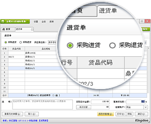 采購進(jìn)貨、退貨,分倉管理,向雙重身份客戶的購進(jìn),現(xiàn)付、賒賬、整單抹零折扣均可處理,滿足日常采購業(yè)務(wù)需求;提供進(jìn)貨單查詢、進(jìn)貨統(tǒng)計(jì)報(bào)告,全面的采購數(shù)據(jù)分析。